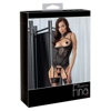 The two adjustable cleavage straps are fancy because they go from the adjustable bra straps to the choker. The choker has a hook and loop fastener. The chains over the breasts and shoulders are decorated with rhinestones and have snap hooks which means that they are removable. The small crotchless string made out of stretchy satin and a removable chain over the crotch is included.