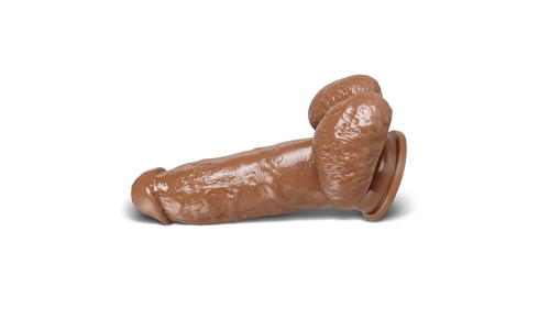 A short but fat realistic-looking dildo complete with testicles and a suction cup base.