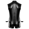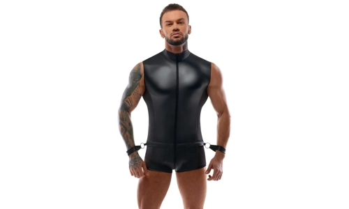 Sleeveless jumpsuit with 2 wrist cuffs in a set from Svenjoyment BONDAGE. The elegant black matte look fits close to the skin. With mesh inserts on the short pants legs for an exciting view. The front features a zip going from the stand-up collar down to the waistband. The pouch has an underlaid zip. Each side of the waistband features a ring for attaching the included wristcuffs. Their adjustable hook-and-loop fasteners makes these soft restraints quick to use for pleasurable bondage games. The back features 6 additional rings for more bondage options.