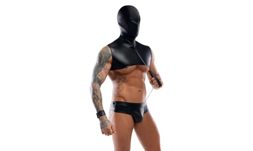 Short hooded top, thong, leash and 2 wrist cuffs in a set from Svenjoyment BONDAGE. The noble black matte look nestles close to the skin. The top only covers the top of the chest and features a clever hood that can be completely closed with a 2-way zip perfectly enclosing the head. The included leash can be attached to a ring at the front of the neck with its snap hooks. The thong has an underlaid zip at the front. The included wrist cuffs can be attached to the ring on each side of the waistband with its practical snap hook chains. The adjustable hook-and-loop fasteners on the restraints allow for pleasurable bondage games.
