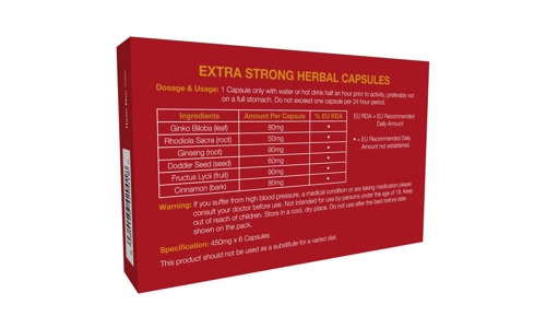 Extra Strong. Extra Strong Herbal Capsules. This formula is an herbal supplement for men based on theories of traditional Tibetan health & science. It extract potent ingredients from natural herbs in Himalayas Mountains 4000m above sea level. It is made up of unique Qinghai-Tibet plateau native material. Increases stamina & maintains a sustainable erection. Enhances performance. Maximum Strength. Herbal basis with no chemical substance. Pharmaceutical grade. Works in 30 mins. No side effects