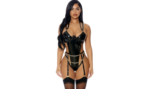 Vinyl teddy features mesh features underwire cups adorned with gold o-ring hardware and chain detail and garter straps.