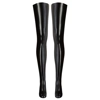 Skinny, thigh high, dipped latex stockings in black. Without shoes.