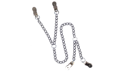 Nipple to labia clamps with chain.