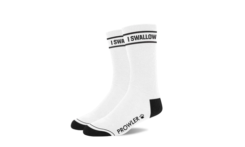 These classic black and white socks are designed to showcase the kinky and playful Prowler RED brand and the sex-positive style that it represents. The sock bands display Swallow , which gives a nod to the very sexy activity. Featuring black along the heel and toes, the bottom of the socks has the Prowler logo printed across the bottom of the sole. Wear these socks with anything! These socks are sure to get people talking and smiling at your openness.