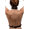 This attractive chest harness has three adjustable buckles to ensure a flattering fit on a range of female bodies. Made of a heavy-duty leather-like material with chrome hardware, it is striking and memorable for BDSM play. Two large D-rings, one at the neck and one at the sternum, serve as attachment points for other accessories such as wrist cuffs, a leash, chains, or rope. Outfit yourself or your submissive in this beautiful and versatile harness.